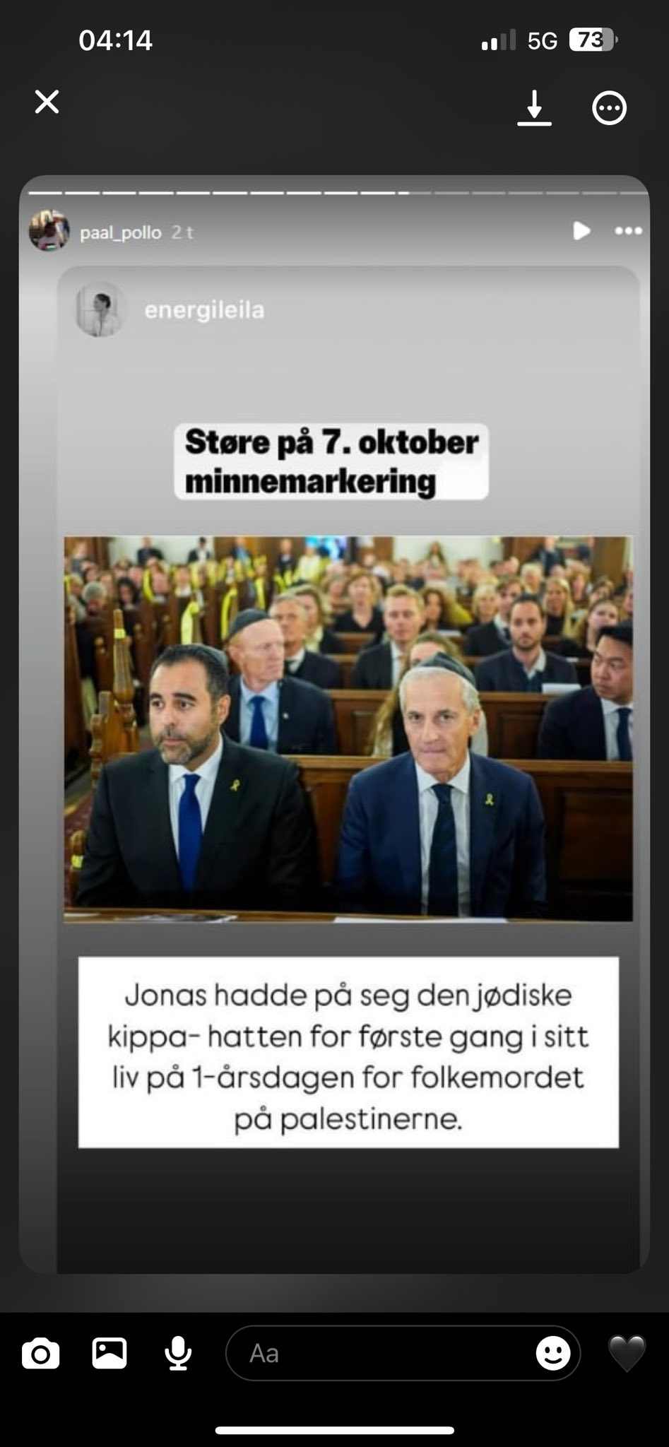 Det ene innlegge viser statsminister Støre og stortingspresident Gharahkhani sittende på en benk i synagogen i Bergstien med kippa på hode og med følgende tekst: «Jonas hadde på seg den jødiske kippa-hatten for første gang i sitt liv på 1-årsdagen for folkemordet på palestinerne.» (se skjermdump under)