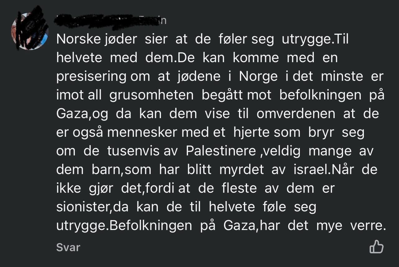 Norske jøder sier at de føler seg utrygge. Til helvete med dem. De kan komme med en presisering om at jødene i Norge i det minste er imot all grusomhet begått mot befolkningen på Gaza, og da kan dem vise til omverdenen at de er også mennesker med hjerte som bryr seg om tusenvis av palestinere, veldig mange av dem barn, som har blitt myrdet av Israel. Når de ikke gjør det, fordi at de fleste av dem er sionister, da kan de til helvete føle seg utrygge. Befolkningen på Gaza har det mye verre.
